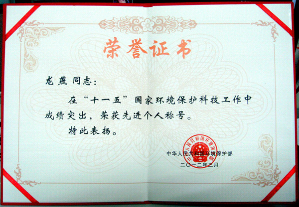 龙燕荣获国家环保部授予的“十一五”国家环境保护科技工作先进个人荣誉称号