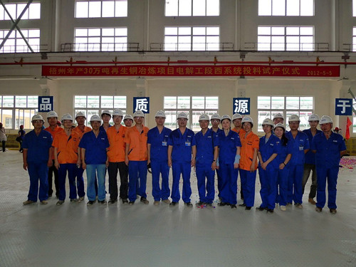 5月5日,由中国瑞林总承包的梧州年产30万吨再生铜冶炼工程电解车间西系统投料试产仪式在电解车间隆重举行。项目部现场员工参加了投料试产仪式,项目部常务副经理戴星华代表总包单位讲话。