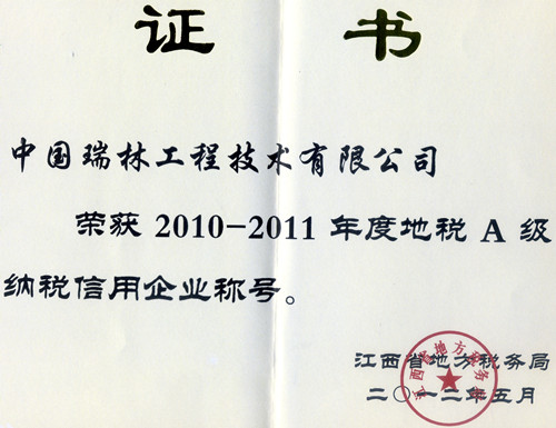 近日,江西省地方税务局《关于“2010—2011年度地税A级纳税信用企业”评定 的通报》(赣地税【2012】77号),中国瑞林荣获江西省地方税务局授予的“2010—2011年度地税A级纳税信用企业”荣誉称号。