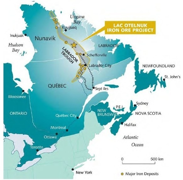 Lac Otelnuk铁矿项目位于世界上最大的铁矿带之一的加拿大拉布拉多地槽内。项目地处亚北极气候带,距离魁北克省南部港口约800公里,该项目有望成为加拿大历史上最大的一个铁矿开采项目。