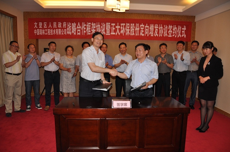 6月14日,中国瑞林工程技术有限公司与山东威海文登区政府战略合作框架协议暨威海正大环保股份公司定向增发协议签约仪式在文登举行。中国瑞林工程技术有限公司总经理吴润华,文登区委副书记、区长吴宏飞,副区长王肇刚,正大环保董事长苏树桂,中色机电总经理刘同升,以及文登区相关部门负责人、中国瑞林相关部门负责人出席了签约仪式。