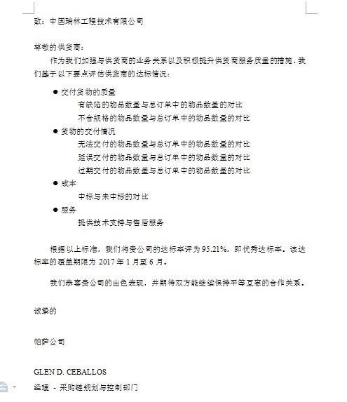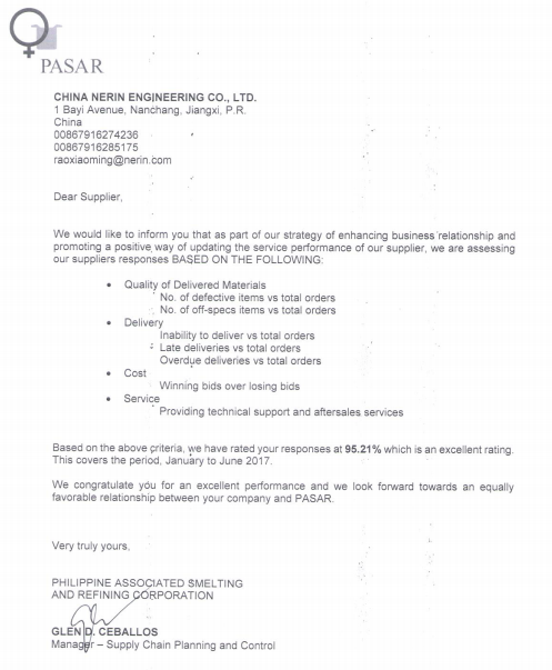 在2017年度PASAR对其全球供应商的评价活动中,中国瑞林在供货设备材料质量、交付进度、成本控制及技术支持和售后服务等方面获评95.21%的高分。PASAR在对中国瑞林表示祝贺的同时,也表示希望一如既往的与中国瑞林保持良好的合作关系。