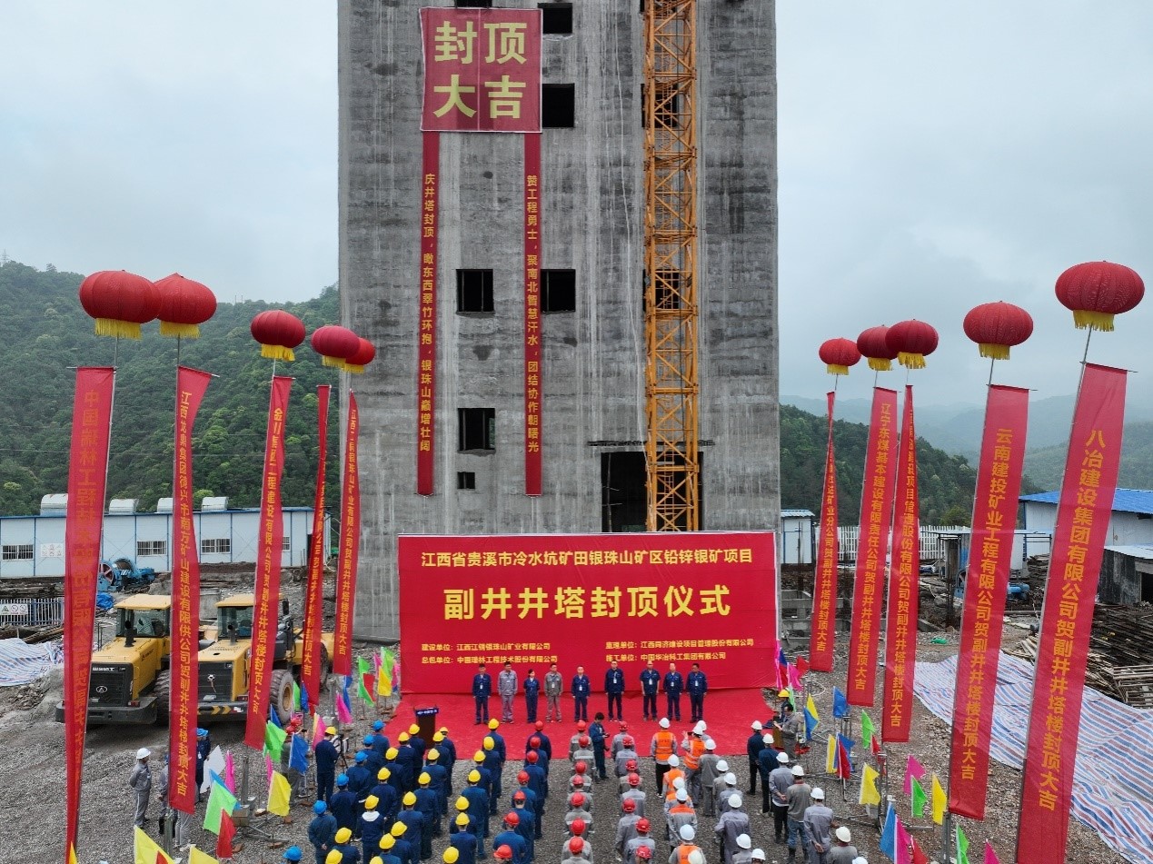 4月20日,由中国瑞林EPC总承包的江西省贵溪市冷水坑矿田银珠山矿区铅锌银矿项目举行副井井塔封顶仪式。
