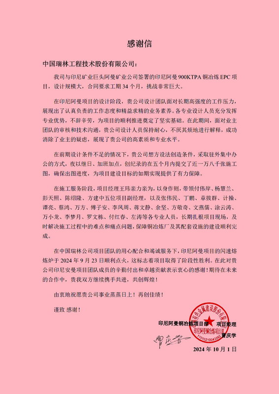 在项目执行阶段,中国瑞林项目团队全方位发挥公司人才、技术、装备和管理方面的优势,始终秉持“以客户为中心”的理念,与项目参建各方密切协作、攻坚克难,精准组织实施,精细开展设计,精心施工服务,高效有序推进项目建设,有力保障了项目如期顺利点火。项目团队专业的职业素养和敬业的拼搏精神,也获得客户以及项目总承包单位中国有色金属建设股份有限公司项目部的认可与感谢。