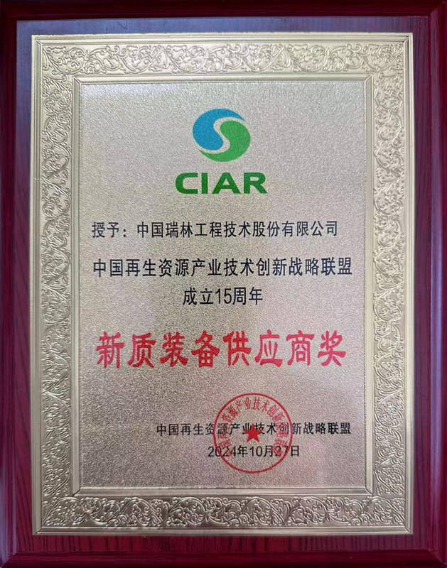 喜讯!中国瑞林获评中国再生资源产业技术创新战略联盟成立15周年新质装备供应商奖