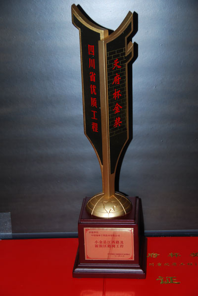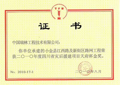 瑞林公司承建的四川省小金县江西路及新街区路网工程荣获四川省建设工程质量安全与监理协会授予的二0一0年度四川省灾后援建项目天府杯金奖,该奖项为四川省优质工程最高奖。特向公司小金项目部全体员工表示热烈的祝贺!
